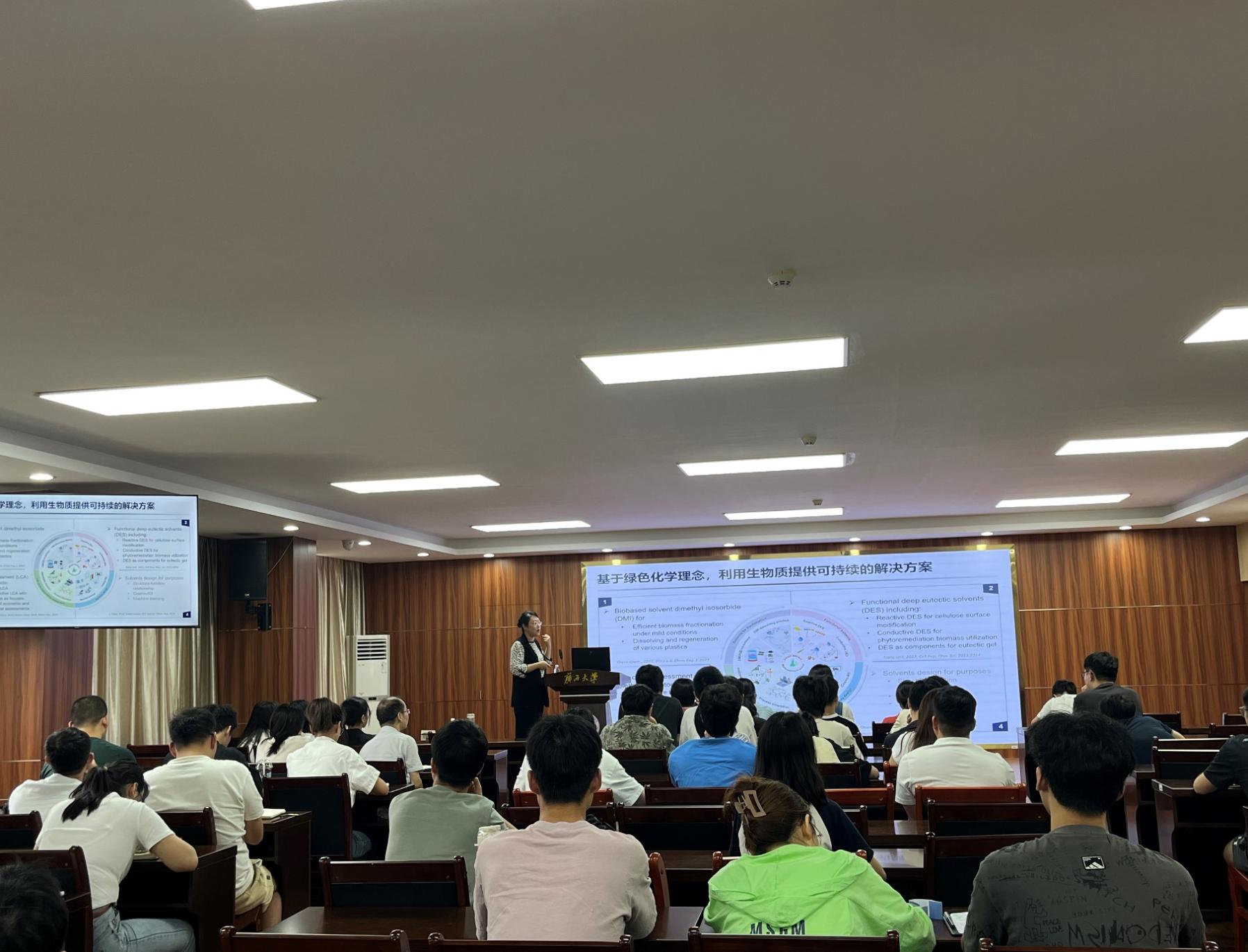 王蕾教授首先从生物质研究现状出发,阐述了绿色溶剂体系的开发与其在生物质炼制领域的应用,包括基于生物基溶剂异山梨醇二甲基醚(DMI)的生物质高效解构预处理技术,实现了木质素高脱除效率和高活性键含量的兼顾;反应型低共熔溶剂(DES)用于生物质纤维素组分提取和改性;基于导电DES体系的生物质预处理和溶剂回收工艺路线。同时王蕾教授讲解了DES体系的电化学性质,为DES体系在生物质炼制领域的应用提供新思路和工艺。最后王蕾教授提出了耦合化工过程模拟的前瞻性生命周期评价方法,为生物质精炼乃至更加广泛的固废资源化利用、绿色化工的可持续发展提供方法论和工具。报告结束,王蕾教授给大家介绍了西湖大学这所国家重点支持的民办新型研究型大学,西湖大学主要以博士研究生培养为起点,着力培养富有社会责任感的拔尖创新人才,目前正通过“申请—考核”制选拔非定向博士研究生,王蕾教授表示非常欢迎广西大学的优秀学生加入他们的科研团队。