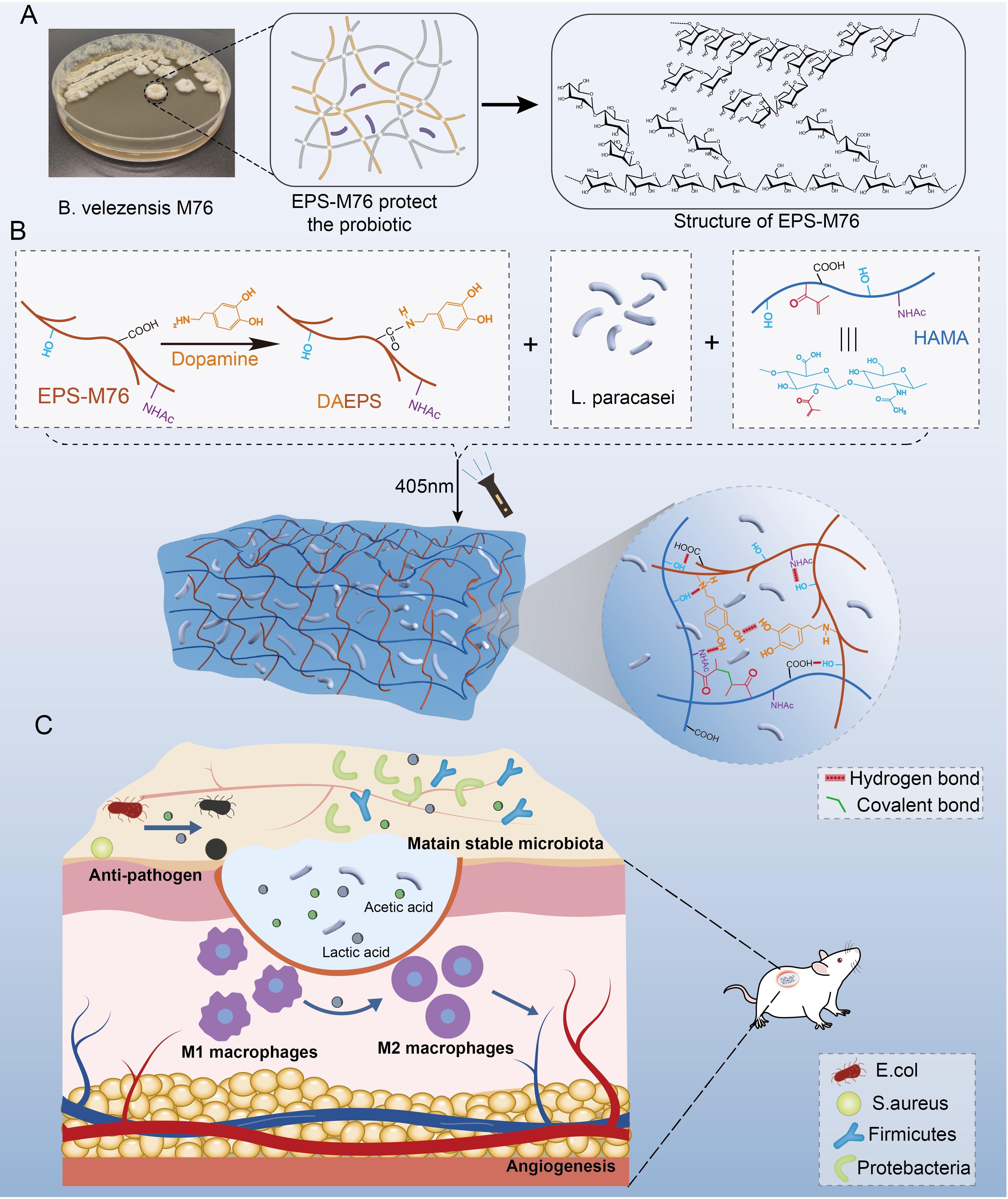 皮肤微生物群在伤口愈合中发挥着重要作用,传统的抗菌水凝胶在杀死致病菌的同时不可避免的抑制皮肤益生菌的生长,从而破坏皮肤菌群的平衡。研究团队基于细菌胞外多糖(EPS),设计了一种既能抵御致病菌又能保持皮肤菌群稳定的活益生菌水凝胶。包埋在水凝胶中的副干酪乳杆菌(Lactobacillus paracasei TYM202)具有促进伤口愈合的活性,而水凝胶基质 EPS-M76具有益生元活性,可促进副干酪乳杆菌的增殖和新陈代谢。此外,该水凝胶可降低伤口愈合过程中的炎症发生率,同时促进血管生成,增加胶原蛋白沉积。该论文得到华南理工大学食品科学与工程小狐狸