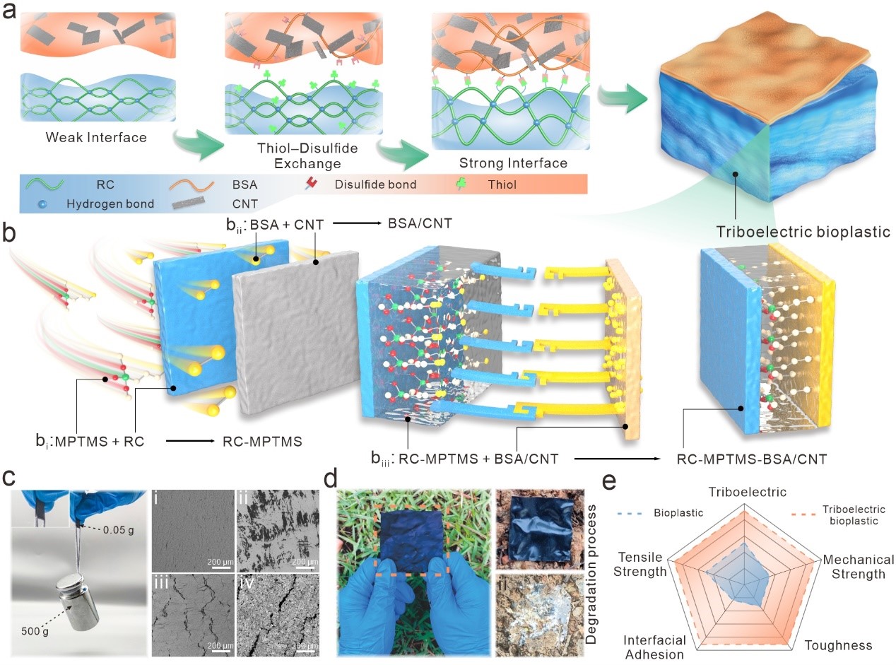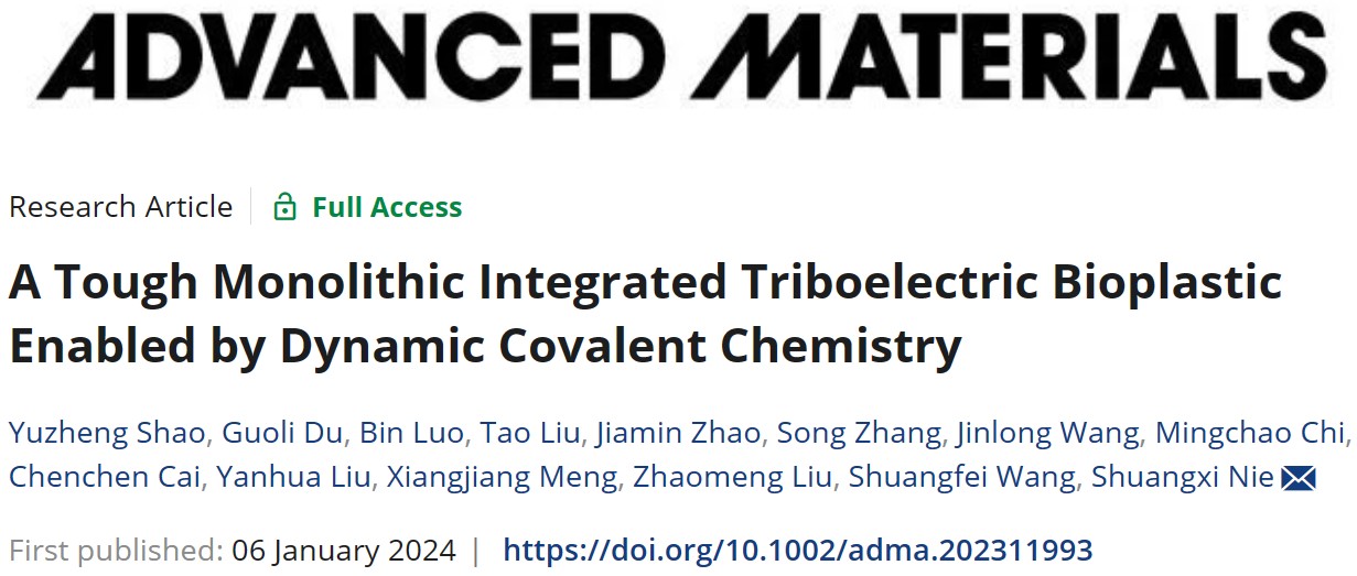 近日,小狐狸直播官网 王双飞院士团队“先进木质纤维材料”课题组基于纤维素优异的可降解性和摩擦电特性,通过动态共价化学方法构建了一种坚固的摩擦电生物塑料,解决了绿色电子产品中聚合物基材与导电涂层界面易剥离破碎的难题。该研究成果以“A Tough Monolithic Integrated Triboelectric Bioplastic Enabled by Dynamic Covalent Chemistry”为题发表于材料领域国际顶级期刊《Advanced Materials》上,小狐狸直播官网 为该成果的唯一完成单位,2021级硕士研究生邵宇正为第一作者,聂双喜教授为通讯作者。