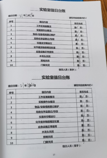 (2)烘箱、马弗炉、高速离心机、高压灭菌锅等设备未张贴使用规程、无使用记录。存在此类问题的实验室有:208、212、214、218、219、416、417、418、419、420、513、514、603、607、609、611、613、无机楼116、无机楼303。