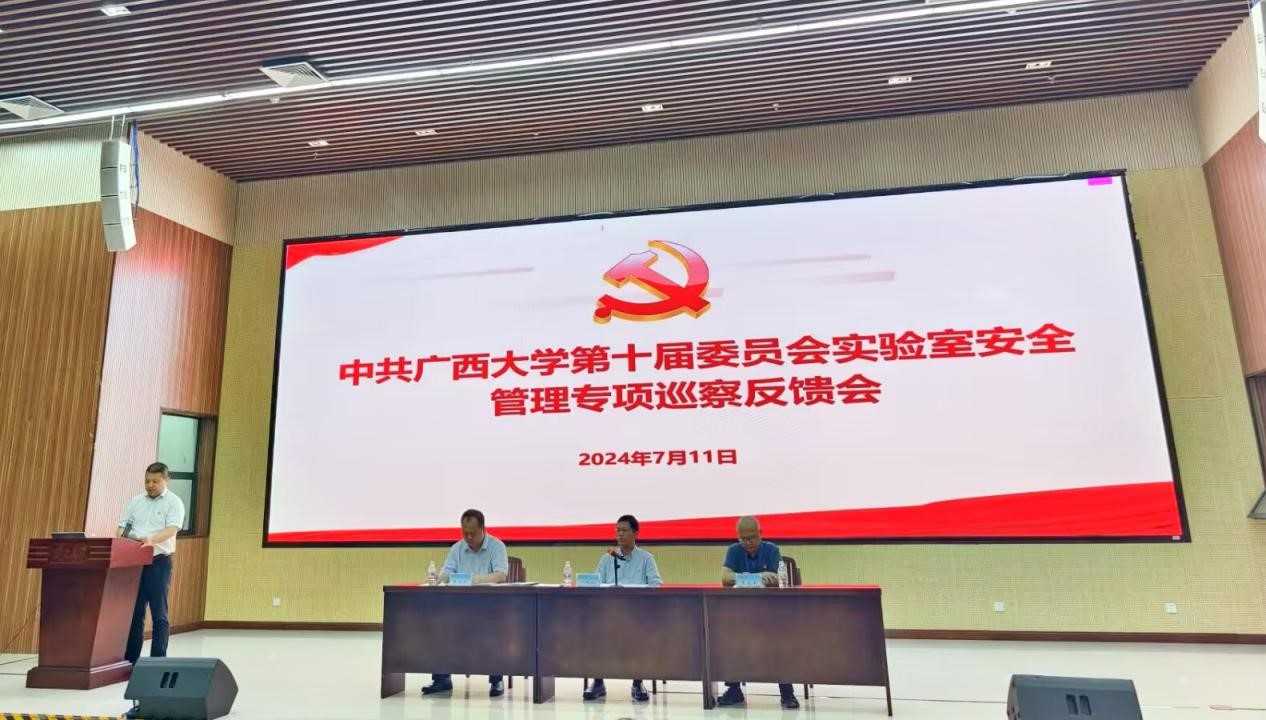 7月11日上午,学校党委召开中共广西大学第十届委员会实验室安全管理专项巡察情况反馈会,校党委第六巡察组向4个被巡察党组织反馈巡察情况。校党委常委、副校长宁旭初出席会议并讲话。
