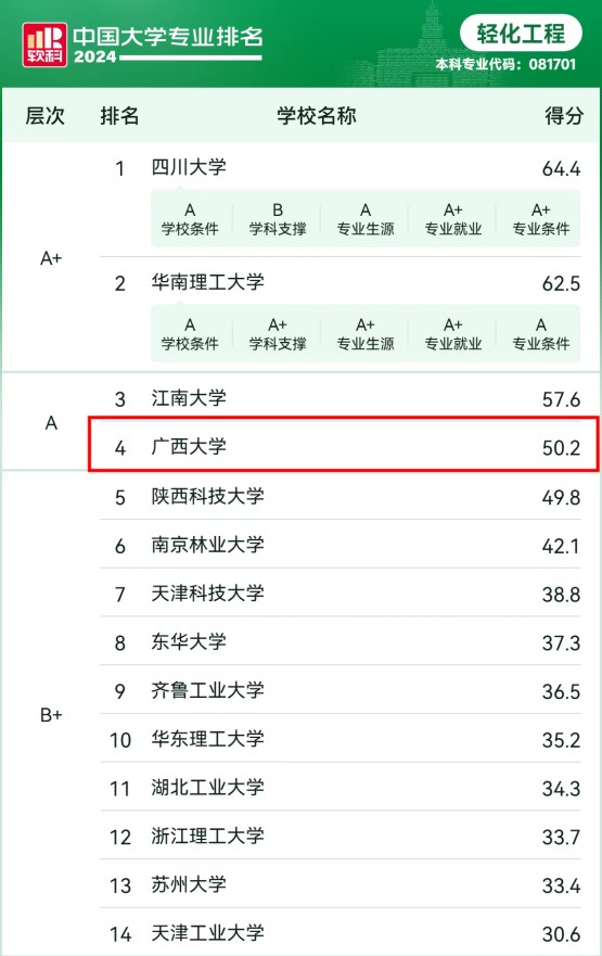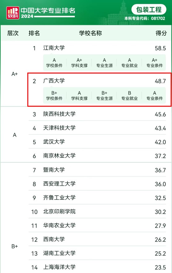 两个专业跻身国内顶尖行列,包装工程专业位列全国第2、轻化工程专业位列全国第4,评级分别为A+和A。