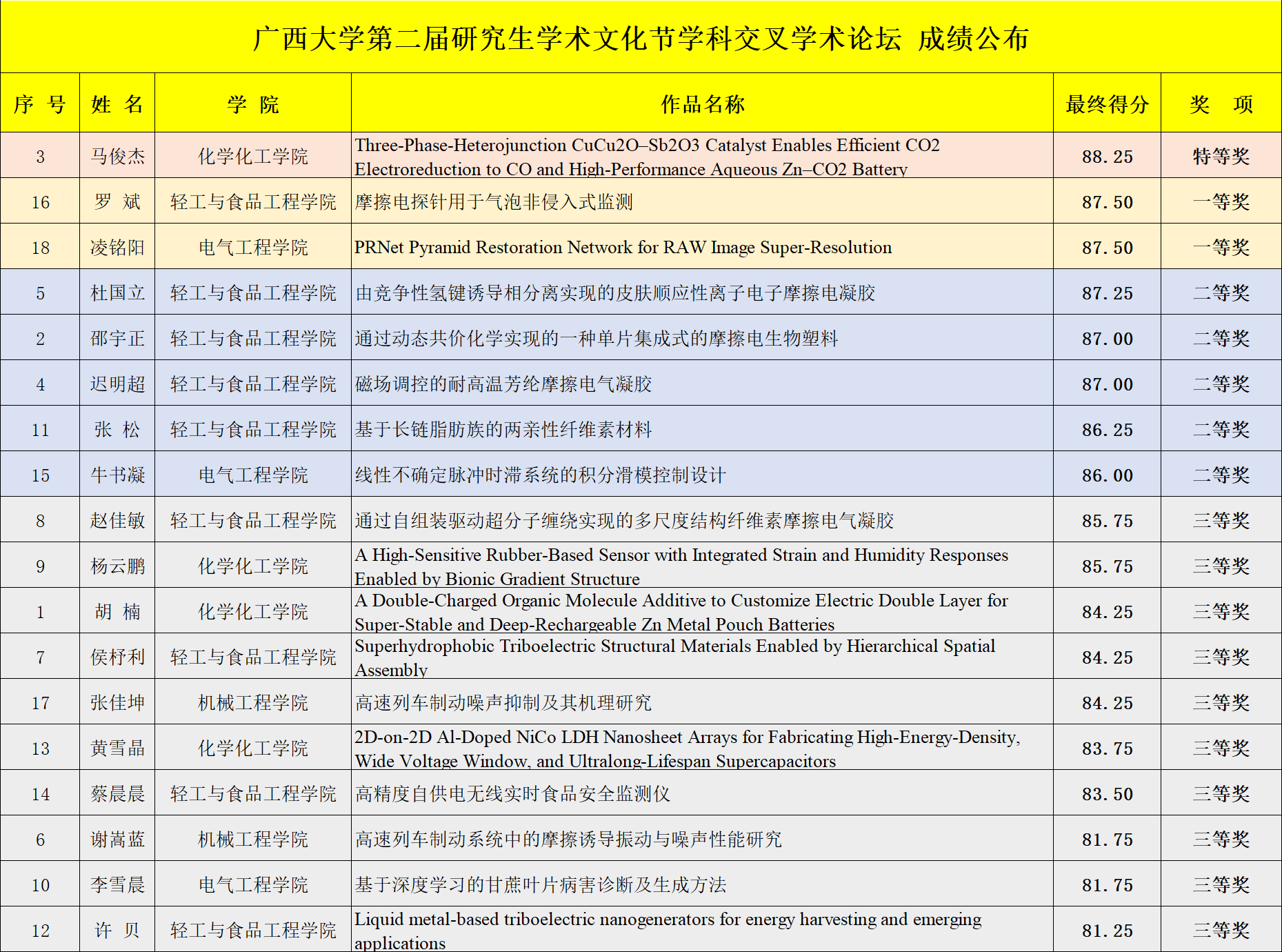 经工作人员统计,现场公布各团队的成绩。广西大学第二届研究生学术文化节 “学科交叉”学术论坛结果如下: