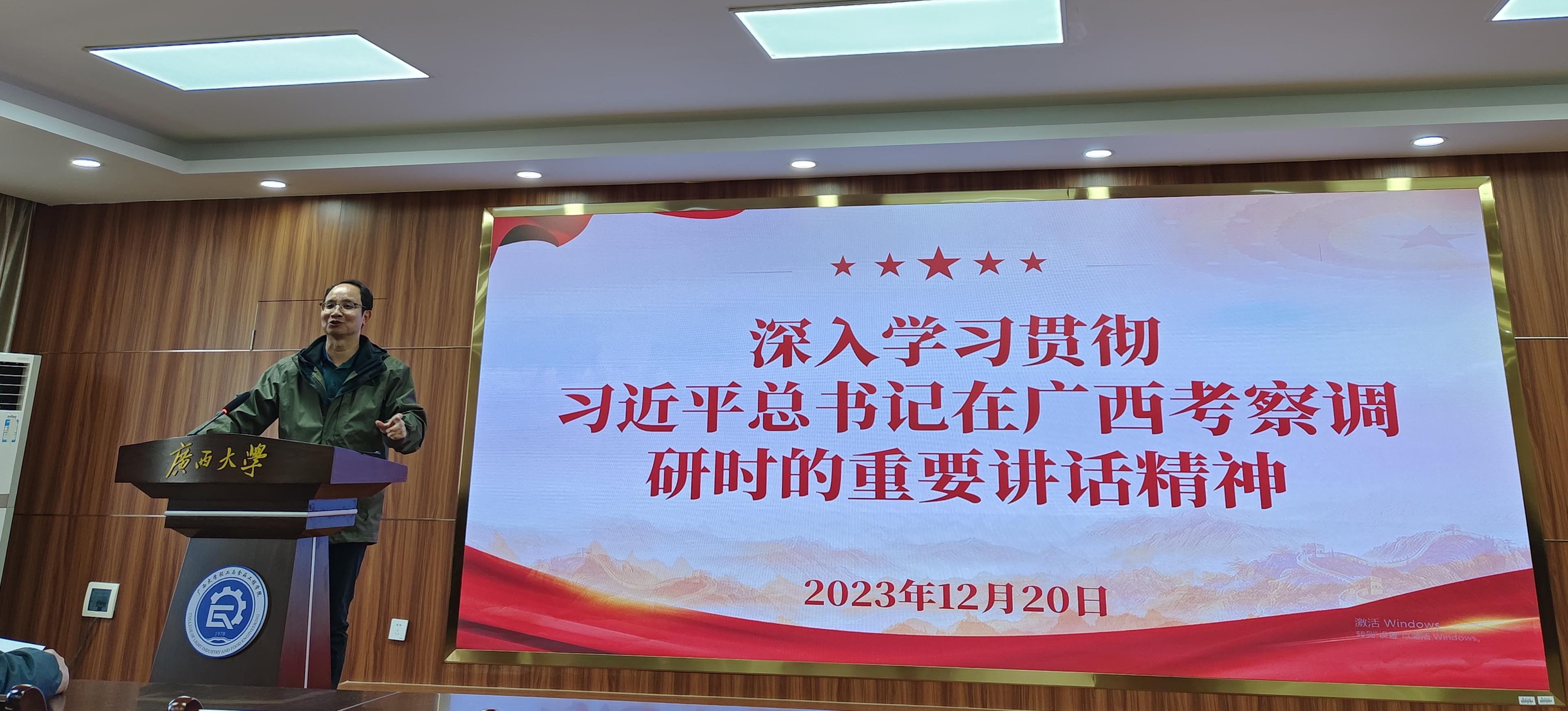 中心主任李凯出席学习活动并讲话。他表示,习近平总书记亲临甘蔗种植基地和制糖企业视察指导工作,振奋人心,备受鼓舞,这是对广大糖农和糖业科技工作者的最大关怀!视察充分彰显了蔗糖业的国家战略地位,体现了习近平总书记对广西糖业高质量发展、国家食糖安全保障的殷切期望。广西大学是全国唯一完整具有制糖工程专业本、硕、博人才培养体系的高校,我们一直致力于科技链与产业链融合,以科技创新推动产业技术进步,研发甘蔗资源梯度多元高值化产品,提升附加值,提高工业反哺农业的能力。习近平总书记对我们新研发的甘蔗系列产品给予了充分肯定,这是对团队最大的鼓励。团队历经20多年攻关成功研制,以物理提取、多级膜纯化为核心技术生产,全球首创将甘蔗含量超过70%甘蔗植物水开发为系列产品,技术的推广应用可使吨蔗产值由700—800元提高至1600元以上,系列成果要加快推广应用。希望老师和同学们以习近平新时代中国特色社会主义思想为指导,牢记习近平总书记的教导,贯彻落实好习近平总书记的重要指示,感恩奋进,艰苦奋斗。通过整合各方优势力量,产学研融合,加强科普阵地建设,科学识糖并合理食糖,避免食糖妖魔化,促进国民身心健康;筑牢专业人才培养基地,以人才培养为产业发展注入新活力新血液;打造产业科研新高地,以科技创新开辟糖业发展新领域新赛道、塑造发展新动能新优势,做真题、题真做,拓面延链,多元发展,把传统“蔗糖产业”打造成为中国式 “甘蔗+” 现代产业,助力乡村振兴,促进产业转型升级,让糖业更好更高质量发展,不辜负习近平总书记的关怀和厚爱!