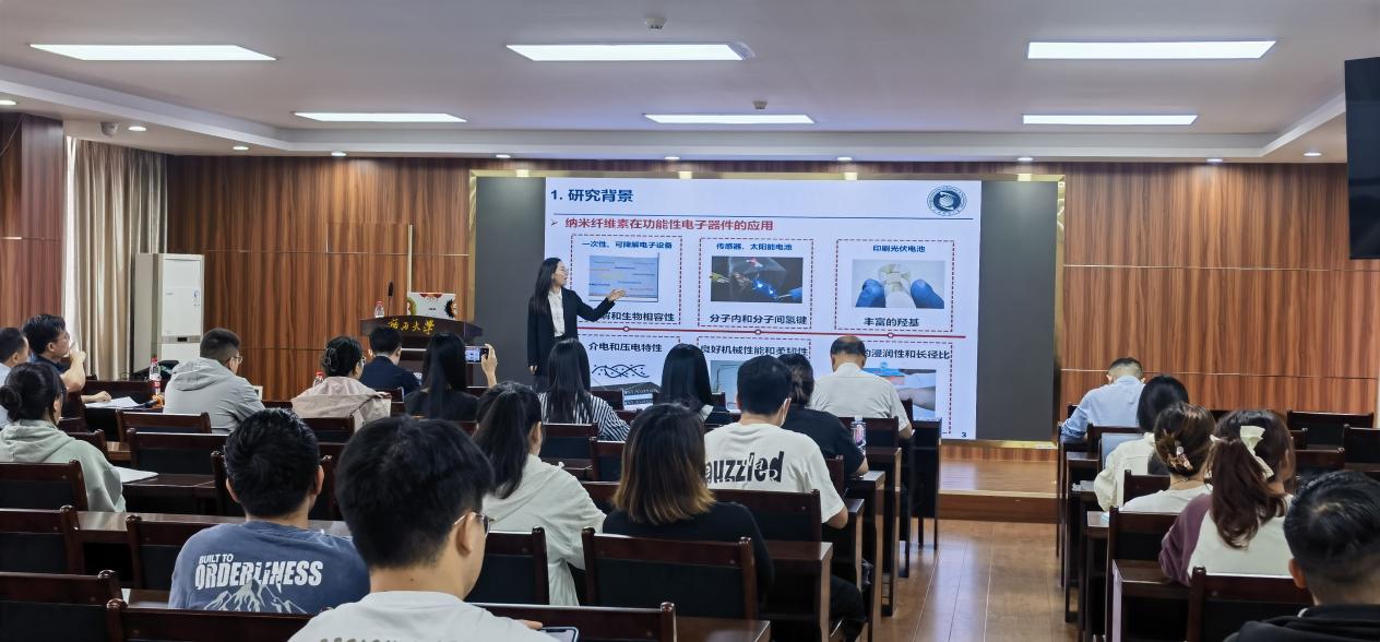 徐婷以“纳米纤维素基功能材料的有序构建及应用”为主题开展分享。纳米纤维素基复合材料具有可再生、低密度、高强度、高模量的特点,徐婷老师介绍了纳米纤维素在功能性电子器件的应用,如一次性/可降解电子设备、传感器、太阳能电池、印刷光伏电池等。她着重讲解了仿生结构纳米纤维素/MXene气凝胶的制备应用研究,实验得出该结构在0.8mA·cm-2的电流密度下提供了849.2mF·cm-2的面积比电容,并在30%的应变下,连续10000次循环后几乎保留了其初始电容,这表明组装器件在高压缩下具有出色的循环稳定性。