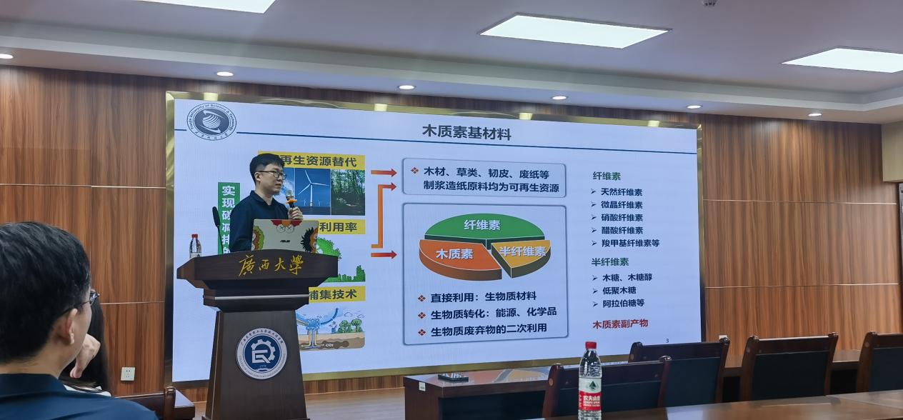 戴林以“木质素基材料构建及应用研究”为主题,与同学们分享了木质素基材料、木质素聚合物复合材料、木质素微纳米材料和木质素凝胶材料,讲述了将柔性电子器件与绿色可回收木质素结合构成液态金属包封体系,最终形成柔性高效可回收电子器件的实验过程。除此以外,戴林还分析了国外木质素智能材料的代表性工作及水热自交联木质素凝胶的合成和应用,他指出:“木质素凝胶成本低,有望成为开发经济、高效堵漏技术的理想原料。”
