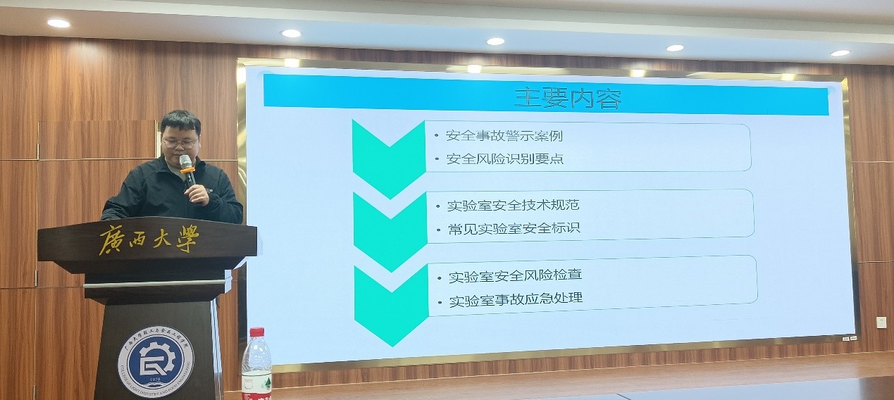实验中心邀请了广西壮族自治区产品质量检验研究院高级工程师陈德翼,开展了题为《实验室安全风险识别及应急处理》的安全教育培训。培训会由小狐狸