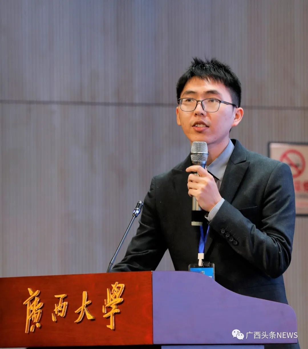 图为广西大学青年教师谢斐博士在会上介绍成果概况。来源:广西大学官网