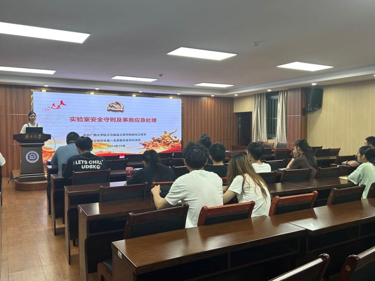各教工党支部主要以“制度学习+实践引领”为双轮驱动开展活动。机关教工党支部组织专题学习研讨会,深入研读学校实验室安全专项整治工作的相关文件,明确行政人员在实验室安全管理中的职责与要求。食品教工支部、制糖教工支部及轻化工程系教工党支部等主要围绕实验室安全规章制度、危险化学品管理、紧急事故应对措施等关键议题展开深入研讨,进一步强化了党员教师的安全责任意识。各学生党支部则通过理论微课、案例分享等形式,深入学习了高等学校实验室安全规范和消防安全管理规范,以及《广西大学实验室安全手册》等重要文件,增强了学生对实验室安全工作的理解与认识。