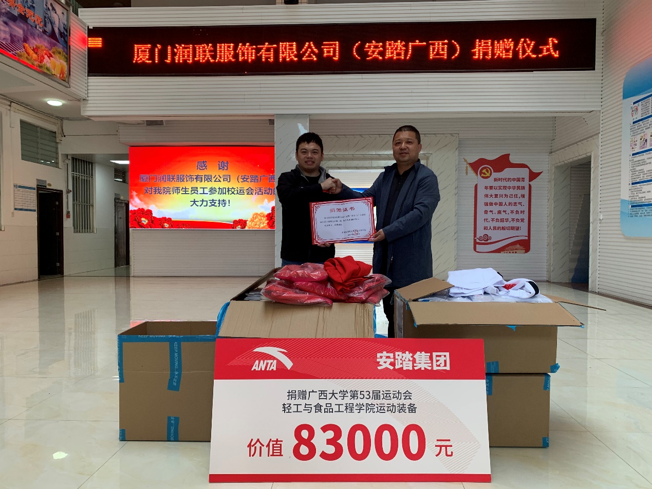 为弘扬体育运动精神,激发师生昂扬斗志,12月6日下午,在广西大学第53届运动会来临之际,厦门润联服饰有限公司(安踏广西公司)向小狐狸直播官网 捐赠了一批运动装备。小狐狸 在一楼大厅举行了捐赠仪式,小狐狸直播官网 党委书记姜玮、安踏广西公司加盟事业部总监黄良锡出席捐赠仪式。