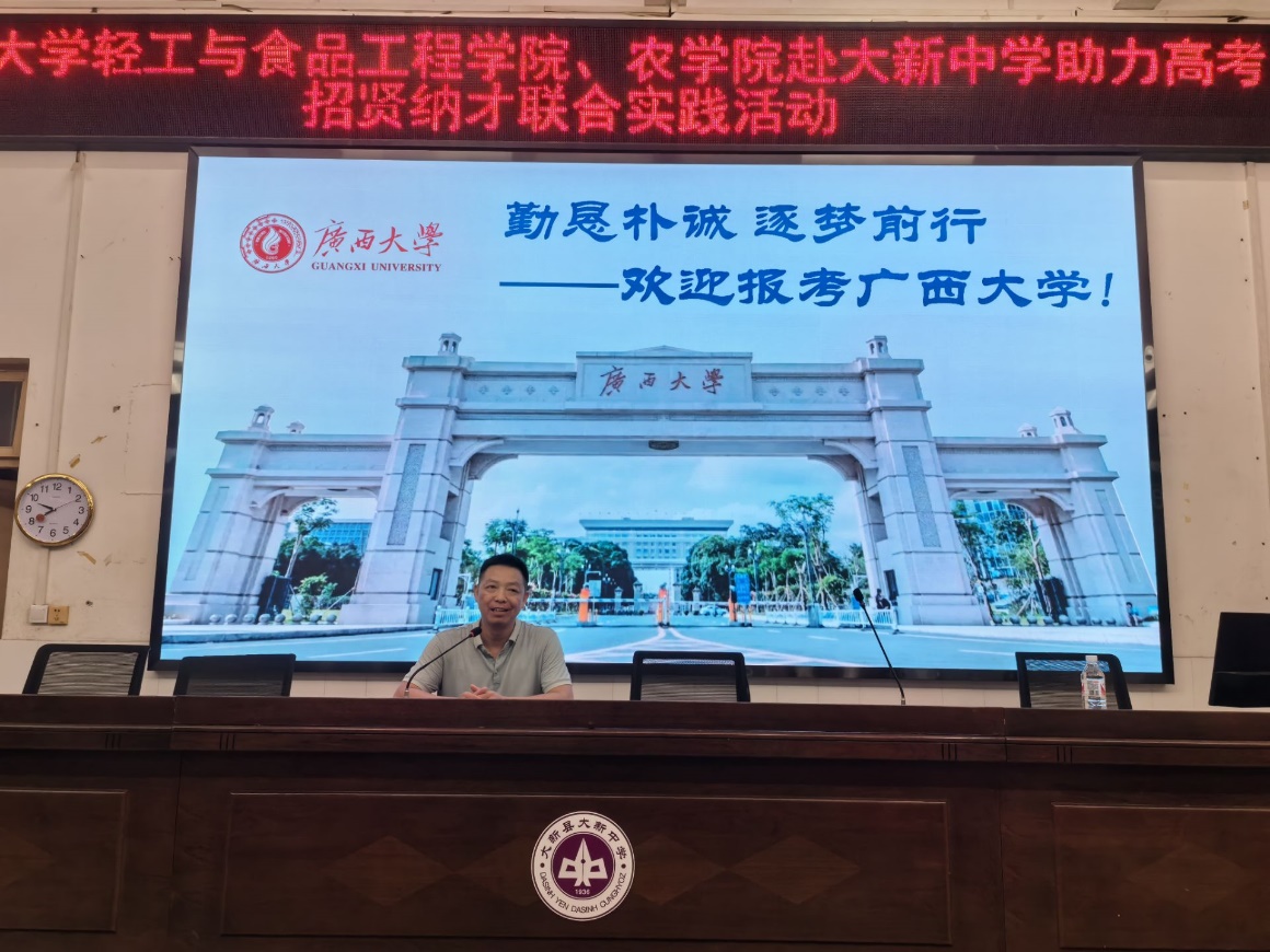 团委书记徐羽、辅导员刘宇、曹羚彬和11名学生代表组成。大新中学黄永战副校长、高三班主任代表以及400名高三学子参加了宣讲会。