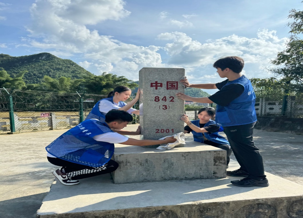 本次实践,实践团师生们前往位于大新县硕龙镇隘江村的中越边境河—归春江畔842号界碑段开展了巡边活动,并对界碑进行擦拭。界碑不仅是祖国边境的标志物,更代表着国家的形象和尊严,不容玷污。一尘不染的界碑象征着祖国强大的实力以及纯洁性,师生们精心擦拭着界碑,让界碑矗立蓝天之下,反射出耀眼的光芒,象征着东方大国用真诚和实力照亮世界的决心。