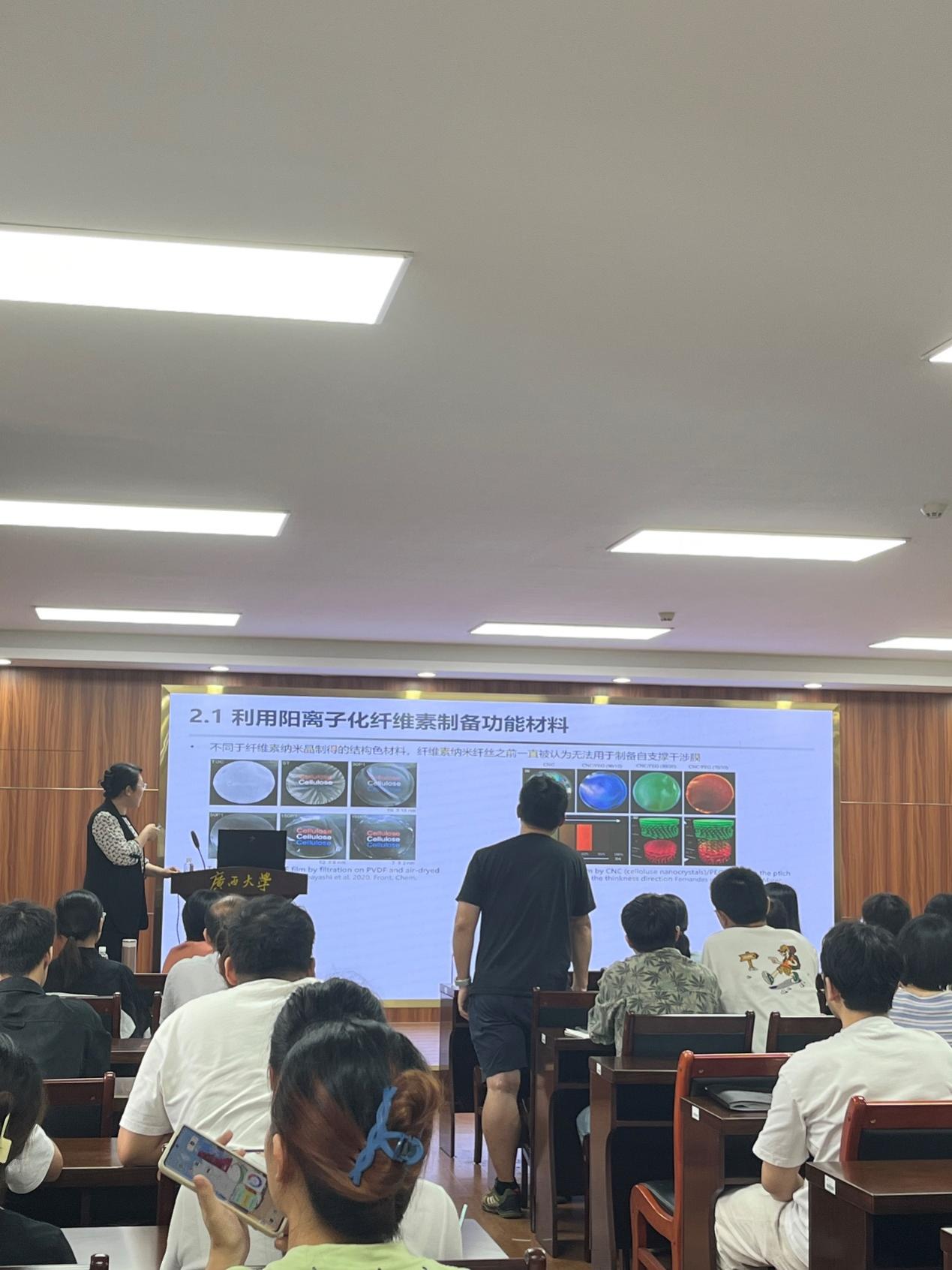 王蕾教授首先从生物质研究现状出发,阐述了绿色溶剂体系的开发与其在生物质炼制领域的应用,包括基于生物基溶剂异山梨醇二甲基醚(DMI)的生物质高效解构预处理技术,实现了木质素高脱除效率和高活性键含量的兼顾;反应型低共熔溶剂(DES)用于生物质纤维素组分提取和改性;基于导电DES体系的生物质预处理和溶剂回收工艺路线。同时王蕾教授讲解了DES体系的电化学性质,为DES体系在生物质炼制领域的应用提供新思路和工艺。最后王蕾教授提出了耦合化工过程模拟的前瞻性生命周期评价方法,为生物质精炼乃至更加广泛的固废资源化利用、绿色化工的可持续发展提供方法论和工具。报告结束,王蕾教授给大家介绍了西湖大学这所国家重点支持的民办新型研究型大学,西湖大学主要以博士研究生培养为起点,着力培养富有社会责任感的拔尖创新人才,目前正通过“申请—考核”制选拔非定向博士研究生,王蕾教授表示非常欢迎广西大学的优秀学生加入他们的科研团队。