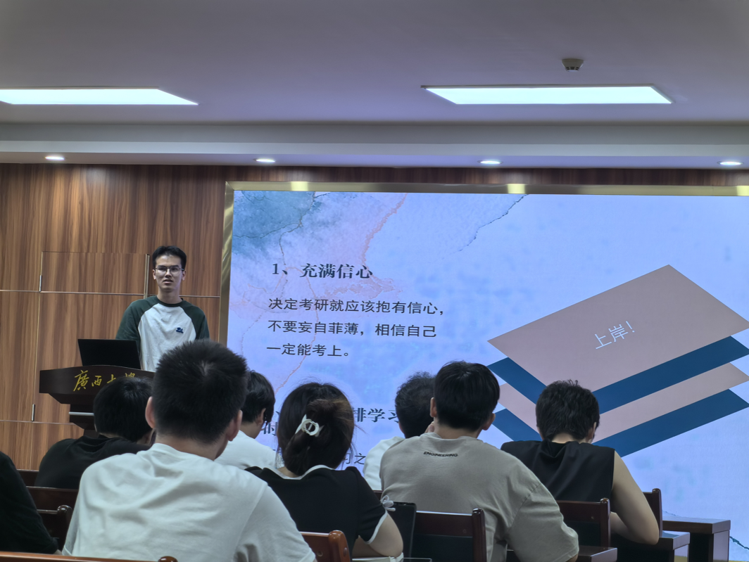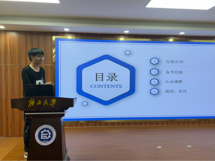 包装201班张凯,考研至中国海洋大学,曾担任班长等主要学生干部,热心服务同学,获得“广西大学优秀学生”、“广西大学优秀共青团员”等荣誉称号。他向大家介绍了考研前期一系列的复习方法,以及复试面试的小技巧,最后向大家强调了调整心态的重要性。