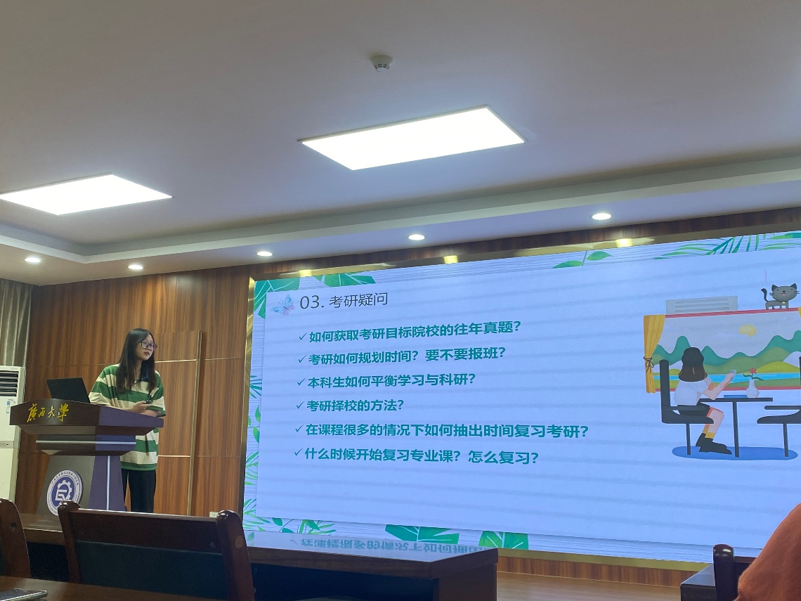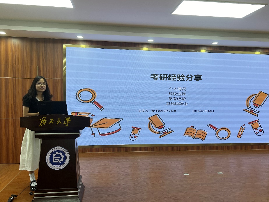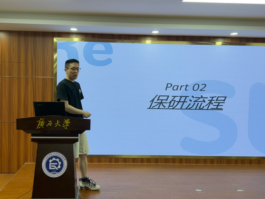 制糖201班徐龙钊,现保研至厦门大学,曾任团委学生会主席团成员,曾获得“广西大学优秀学生干部” 、“广西大学优秀共青团干部”等荣誉称号。他从推免的流程、自我定位、目标院校选择、精准定位和保研资料整理等几个方面为同学们提供了保研经验指导。