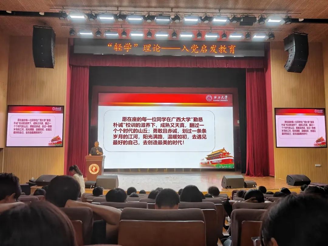 最后,姜玮希望在座的每一位同学在广西大学"勤恳朴诚"校训的滋养下,成熟又天真,翻过一个个时代的山丘;勇敢且赤诚,划过一条条岁月的江河,阳光满路,温暖如初,去遇见最好的自己,去创造最美的时代!也希望同学们能够早日加入中国共产党!